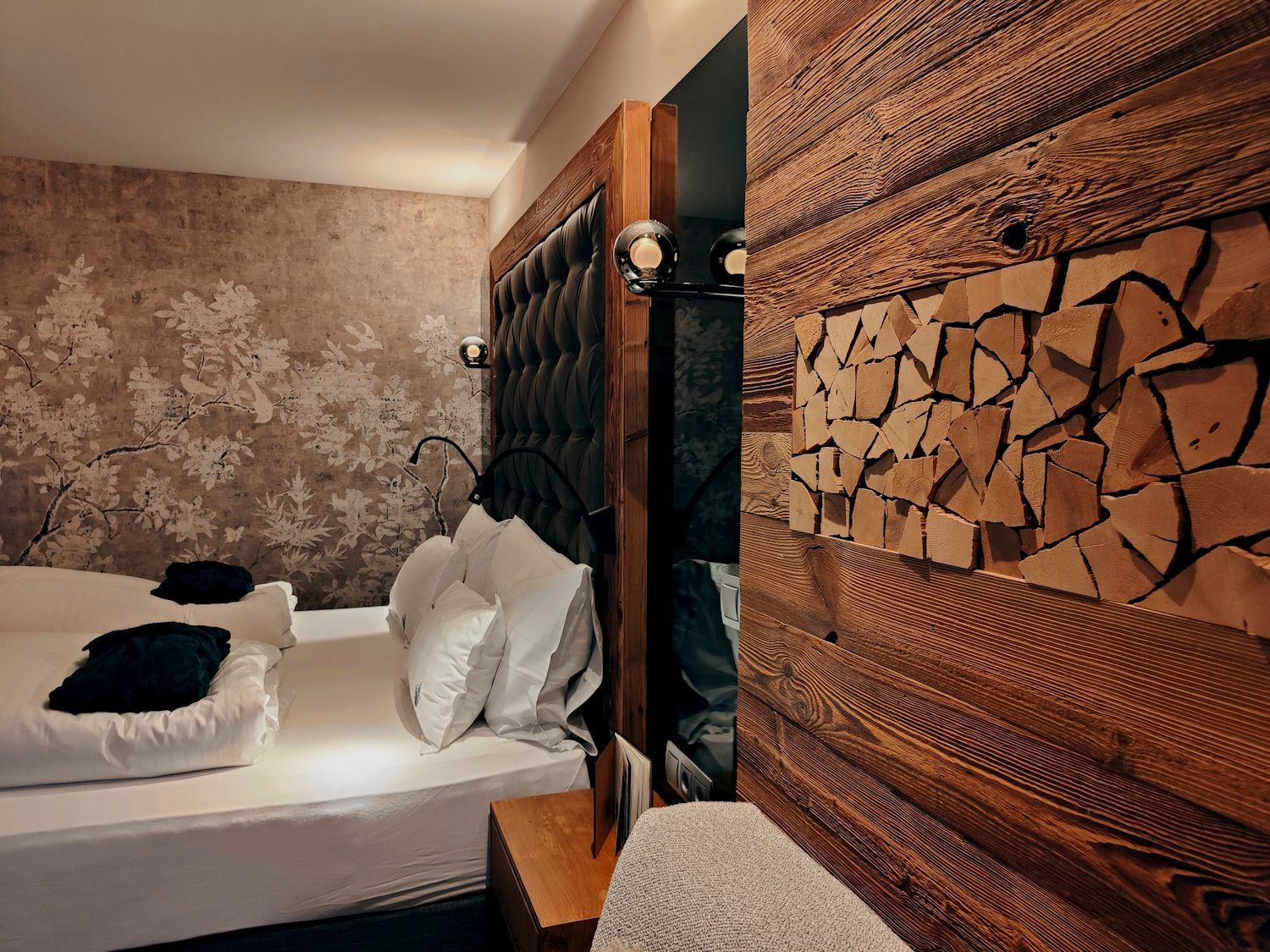 Das moderne Chalet-Feeling des Zimmers hat uns sofort angesprochen. Die gemütliche, naturverbundene Atmosphäre erinnerte an traditionelle Berghütten und verbindet alpine Wohnkultur mit zeitgemäßem Komfort. Dieser gelungene Mix schafft Raum für Entschleunigung und ermöglicht ein bewusstes Ankommen im Hier und Jetzt. Die Gestaltung setzt auf viel Massivholz, flauschige Textilien, gedämpfte Lichtakzente, warme Farben und naturnahe Dekorationen. Das Zimmer wird jedenfalls seinem Namen „Tyrol“ in jeder Hinsicht gerecht.
